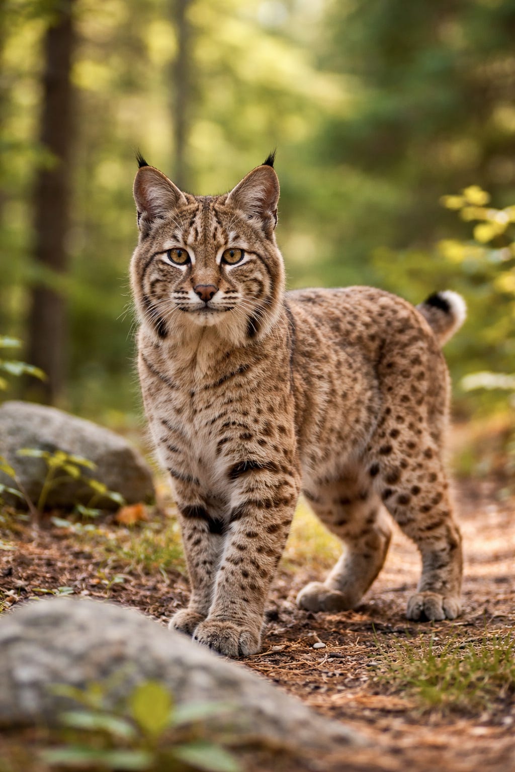 Bobcats look similar to large house cats but are stronger and more muscular. They have brown or gray fur covered with dark spots and stripes that help them blend into forests and rocky areas. One of their most special features is their short “bobbed” tail, which gives the bobcat its name. They also have pointed ears with small tufts of hair and sharp yellow eyes that help them see well at night.