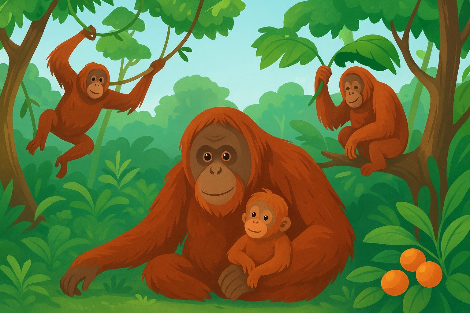Orangutans are endangered, which means only a limited number are left in the wild. Their rainforests are being cut down for farming and buildings, making it hard for them to find food and a safe home. Many organizations and scientists around the world are working hard to protect orangutans and their forests. Learning about them — like you are doing right now — is a great step to help!